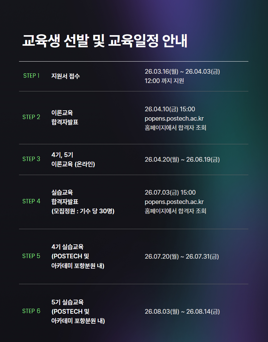 | 실습 | POSTECH 캠퍼스(포항) | 4기 | 2026년 7월 20일(월) ~ 7월 31일(금) |